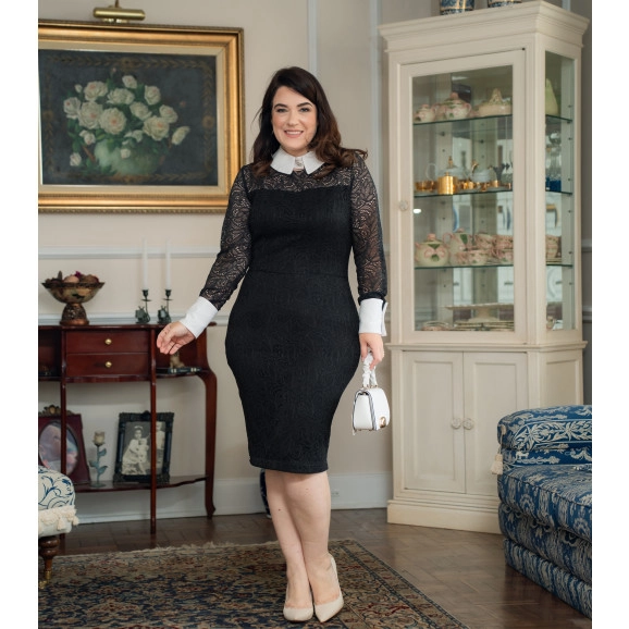 VESTIDO PLUS SIZE EM RENDA, FORRADO, COM ZIPER NAS COSTAS E DETALHE DE GOLA E PUNHO FUNCIONAIS COM BOTÕES JÓIA. COMPOSIÇÃO (87% POLIAMIDA E 13% ELASTANO).