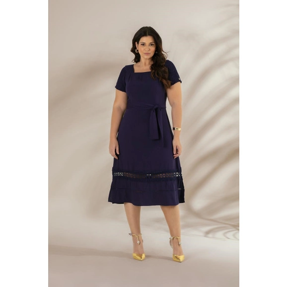 Os detalhes em guipir vazado e palitinho na barra adicionam um toque de sofisticação e charme à peça, enquanto as aberturas laterais até a altura do joelho trazem maior fluidez ao modelo.