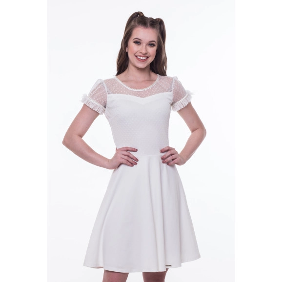 Detalhe: vestido godê com detalhe em tule na parte superior do vestido, possui acabamento em pérolas. Look lindo, super delicado, ideal para casamento no civil.