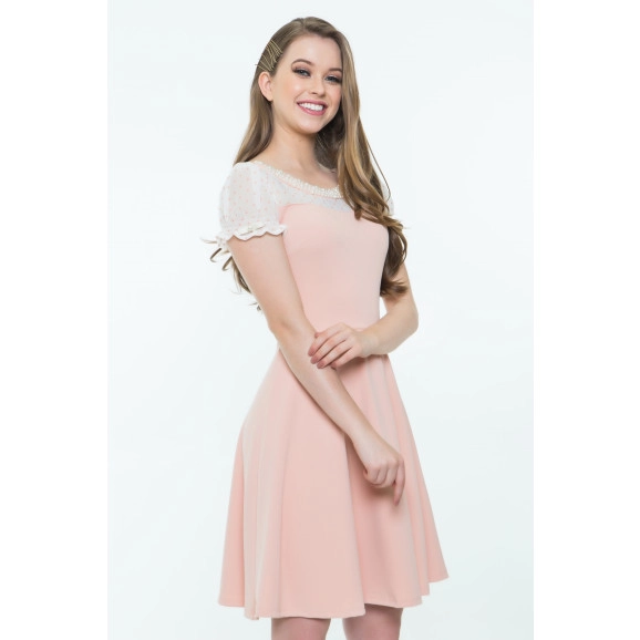 Detalhe: vestido godê com bordado em pérolas na gola, possui elástico e detalhe em laço nas mangas, fechamento em zíper atrás. Look delicado, romântico, ideal para casamentos e formaturas!