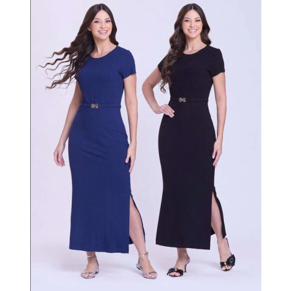 Vestido em malha canelada, decote redondo, mangas curtas, acompanha faixa e fivela de metal, fenda nas laterais e possui anágua.