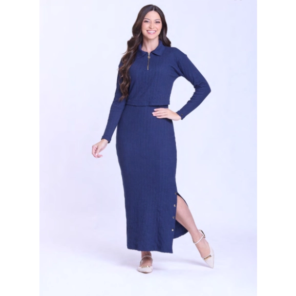 Vestido em malha canelada, decote com gola e zíper de metal com pingente, blusa sobreposta, mangas longas, botões de pressão na lateral da saia e possui forro.