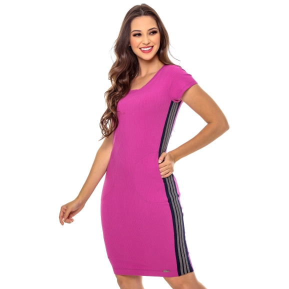 Vestido de malha canelada. Possui modelagem ajustada, recorte com aplicação de galão colorido nas laterais e bolsos funcionais. Composição: 96% viscose 4% elastano
