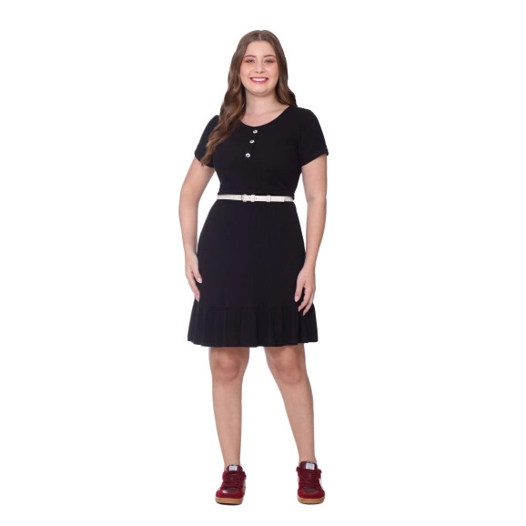 Vestido confeccionado em malha texturizada e ribana, decote com acabamento em ribana, revel frontal falso em ribana com botões fixos, mangas com punho em ribana, cintura com elástico interno, acompanha cinto e possui forro.