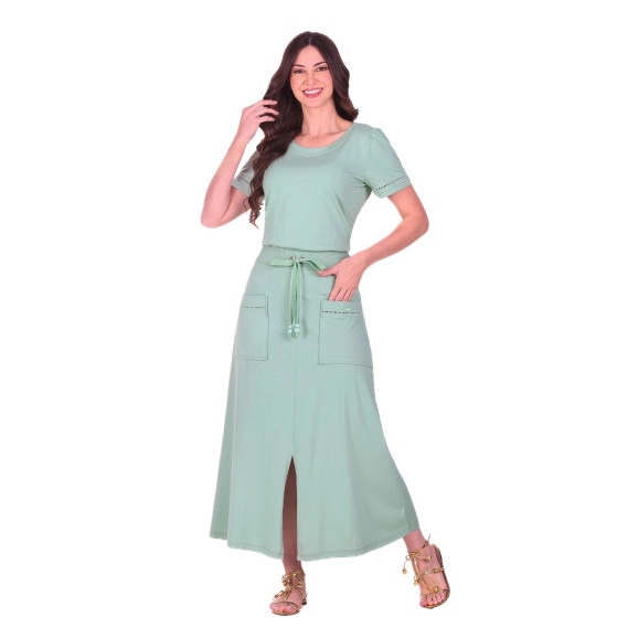 Vestido confeccionado em malha algodão sustentável e ribana, decote redondo, mangas curtas com entremeio de guipir, ribana na cintura com ilhós, galão e ponteiras, bolsos funcionais com detalhe em entremeio de guipir, fenda frontal e possui forro.