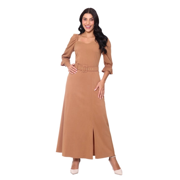 Vestido confeccionado em malha texturizada, decote em ribana, revel frontal com botões funcionais, mangas com leve franzido, canaleta com rolete funcional, bolsos funcionais, fenda frontal e possui forro..