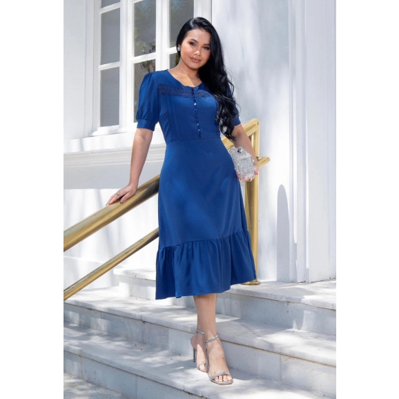 Vestido Sônia Em Tecido Crepe Pele de Pêssego Azul Maria Amore