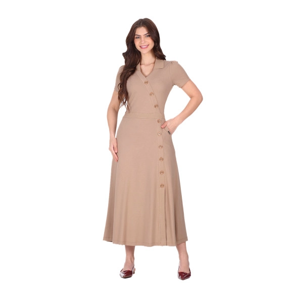 Vestido confeccionado em malha piquet e ribana, decote em V com gola, revel falso com botões fixos, bolsos funcionais e possui forro.