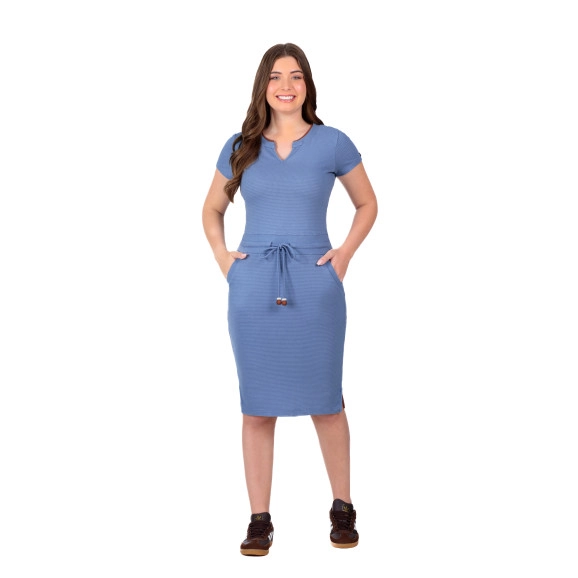 Vestido confeccionado em malha texturizada, ribana e malha lisa, decote redondo com V em ribana com detalhe em vivo em malha lisa, mangas curtas, cós em ribana com canaleta e viés, bolsos funcionais com ribana, fenda nas laterais e possui forro.