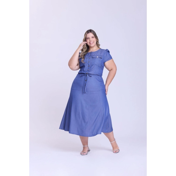 Vestido em tecido plano, decote redondo, fechamento frontal por botões, mangas curtas, bolsos funcionais e lapela, canaleta com faixa e possui forro.