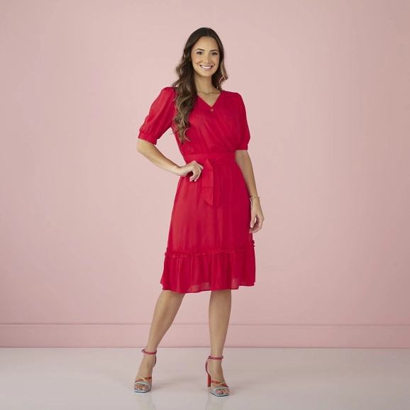 Confeccionado na Viscose, decote transpassado, manga curta com elástico na barra, cintura com elástico, modelagem evasê, saia com babado na barra, forrado.