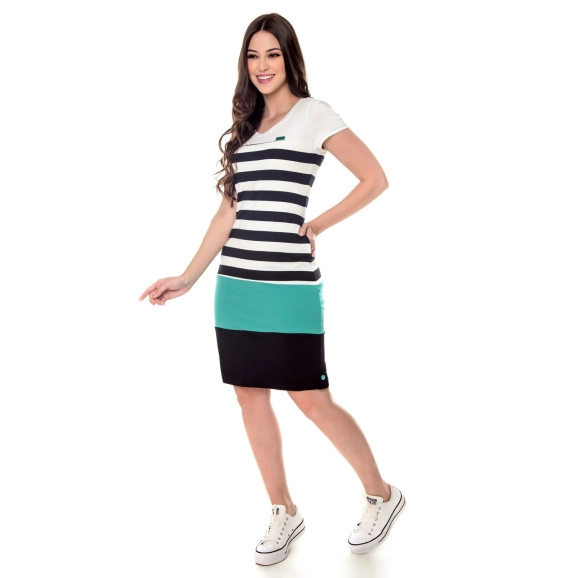 Vestido com composê de tecido liso e listrado com recorte, costuras e plaquinhas coloridas. Possui martingale nas laterais com botões personalizados. Composição: 96%Algodão-4%Elastano. Vestido Lindo, super confortável, ideal para curtir o final de semana com a fámilia!