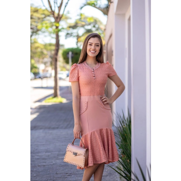Detalhe: Vestido Tubinho modelagem peplum possui detalhe em renda, bordado em pérolas.Look elegante, sofisticado e super feminino!