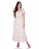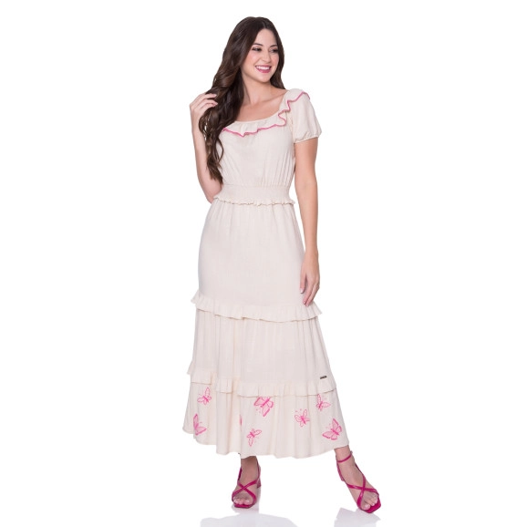 Vestido em tecido plano liso com bordados industriais, babado no decote, mangas levemente bufantes, cós em lastex, saia com recortes e babados. Possui forro.