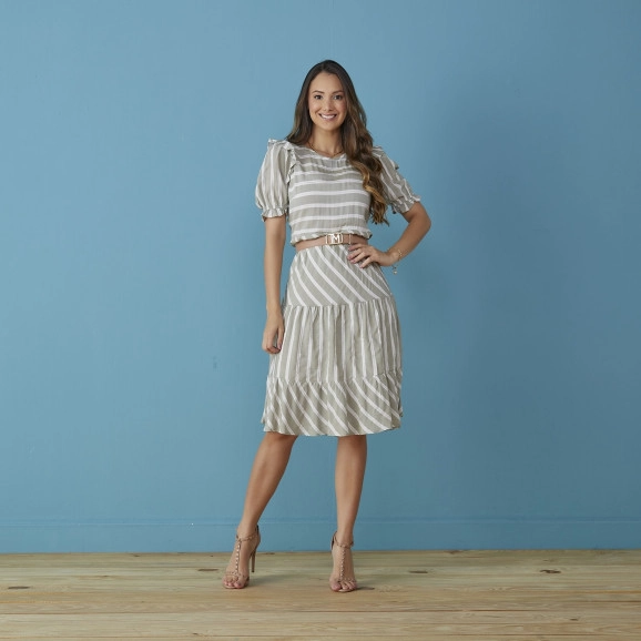 Vestido Viscose Listrado Verde Tatá Martello, Vestido Tatá Martello confeccionado na viscose, forrado, listrado, decote redondo, manga curta com detalhe de babado, saia três marias. Composição: 98% Viscose, 1% Poliéster, 1% Poliamida.
