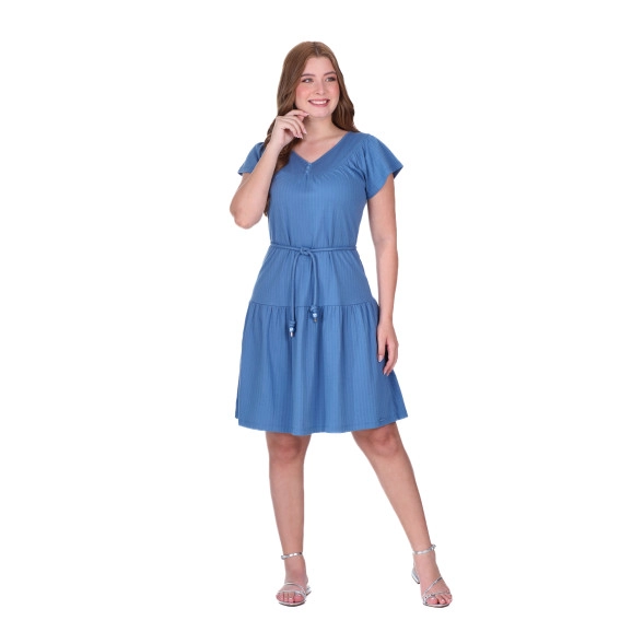Vestido confeccionado em malha texturizada com risca, decote em V com botões fixos e acompanha cordão encapado do próprio tecido e ponteiras.