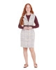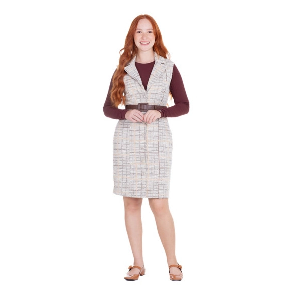 Vestido confeccionado em mix de tecidos, sendo malha ribana e tweed com fio lurex. O vestido em tweed fechamento frontal por botões encapados, modelo sem manga, bolsos funcionais, acompanha blusa com manga longa e cinto. Composição blusa 60% polietser 36% viscose 4% elastano vestido 75% poliester 25% algodão 3% elastano.