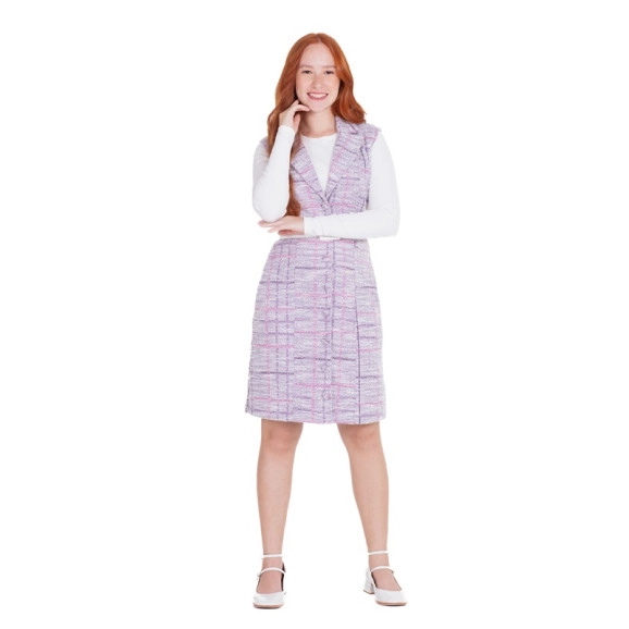 Vestido confeccionado em mix de tecidos, sendo malha ribana e tweed com fio lurex. O vestido em tweed fechamento frontal por botões encapados, modelo sem manga, bolsos funcionais, acompanha blusa com manga longa e cinto. Composição blusa 60% polietser 36% viscose 4% elastano vestido 75% poliester 25% algodão 3% elastano.
