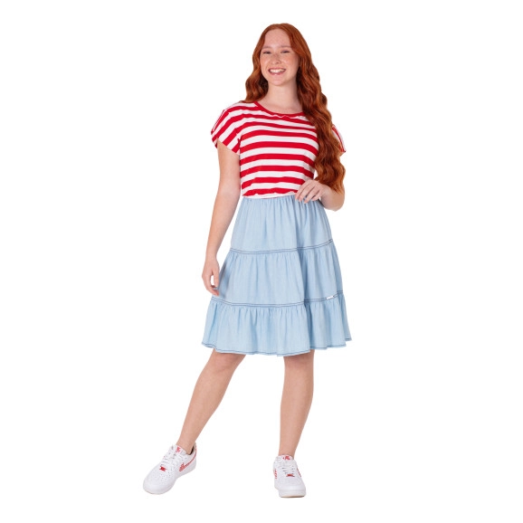 Vestido confeccionado em malha listrada e jeans leve, decote em ribana, mangas com leve franzido, cintura com elástico interno e saia em jeans leve com babados.